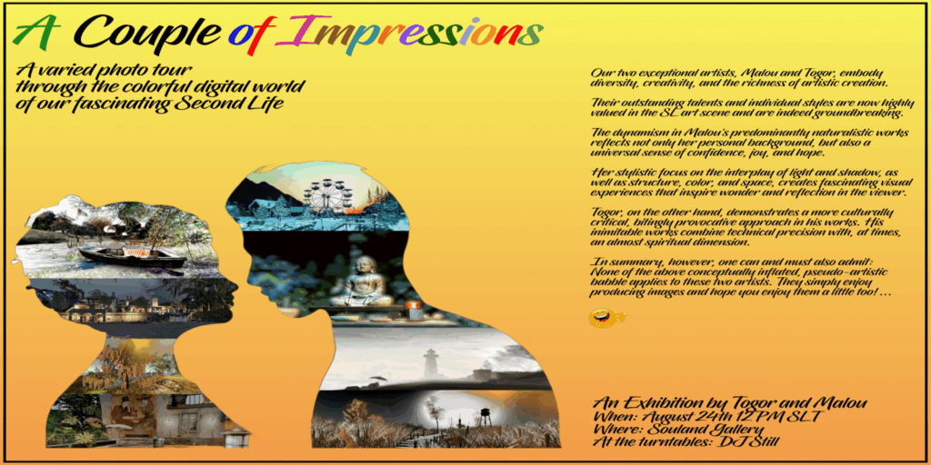 Join us at Souland Gallery this Sunday, August 24th, at 12 PM SLT, and get ready for a delightful surprise! In a realm where artistic expressions can sometimes feel bogged down by heavy intellectualism, two artists—Malou and Togor—are here to remind us that, at its core, art is all about the joy of creation.