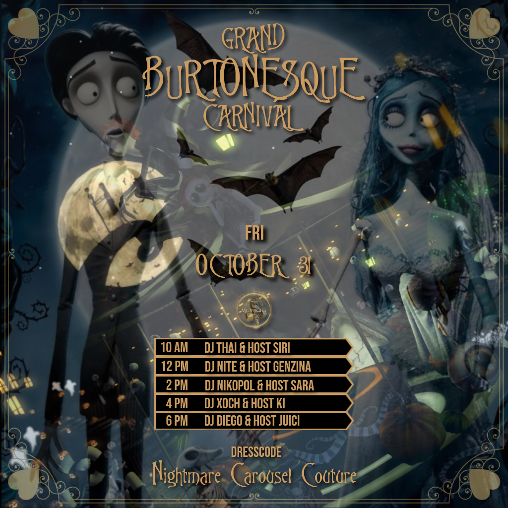We implore you to embrace the spirit of the evening with a dress code that pays homage to any Tim Burton film. Whether you arrive as a striped specter from the Neitherworld, a beautifully stitched bride, a dapper demon with a glint in his eye, or a clockwork clown with a mischievous grin – this is your grand stage! Don’t just attend; become the art.